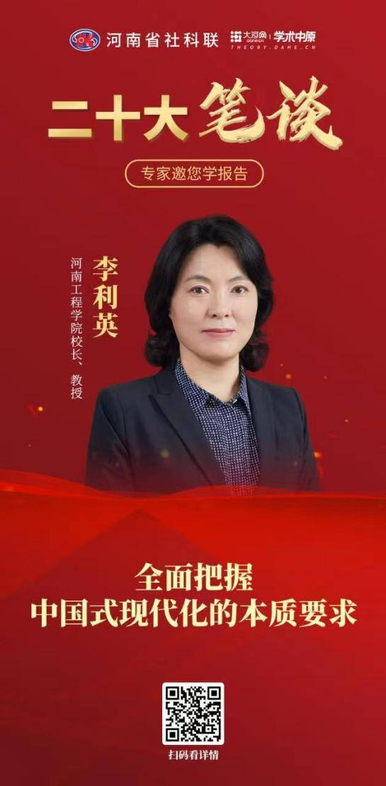 为深入学习宣传贯彻党的二十大精神,近日,河南省社科联推出二十大特别策划——“聚焦二十大·一起学报告——全省社科界学习宣传贯彻党的二十大精神专家谈”,邀请社科界专家学者结合各自研究领域学报告、谈认识,说体会、讲道理,由大河网陆续推出。河南工程学院校长、教授李利英的文章《全面把握中国式现代化的本质要求》刊登在专题四“以中国式现代化全面推进中华民族伟大复兴”第4篇当中。
