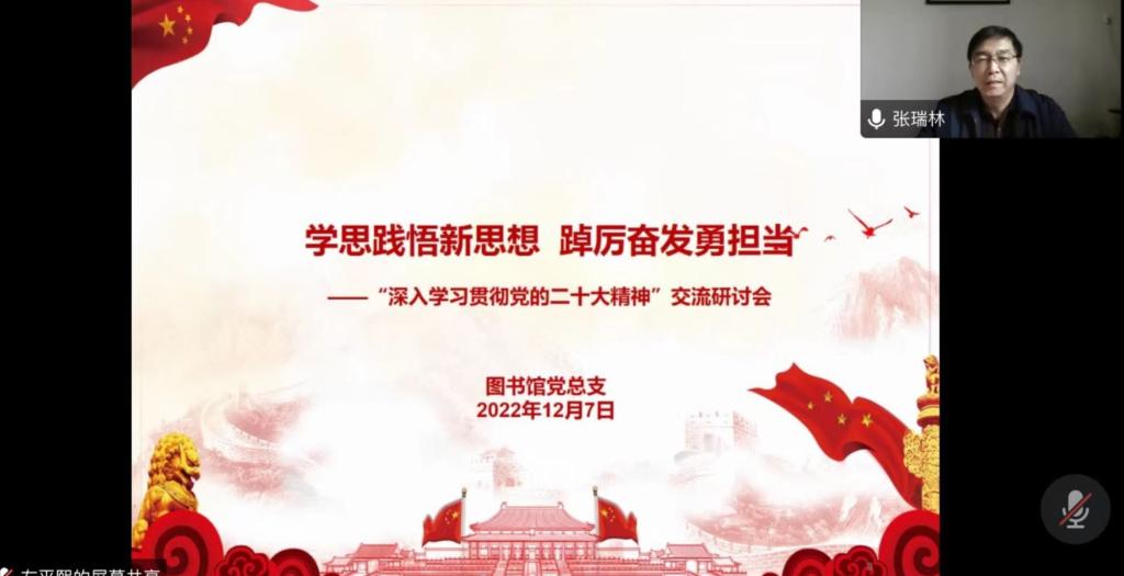 为深入学习贯彻党的二十大精神,认真领悟二十大提出的新思想新论断,做出的新部署新要求,图书馆党总支于12月7日组织全馆党员干部召开了以“学思践悟新思想 踔厉奋发勇担当”为主题的二十大精神学习研讨会。副校长张瑞林出席会议,图书馆党总支书记方月主持会议。