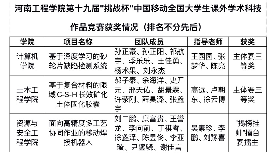 近日,第十九届“挑战杯”中国移动全国大学生课外学术科技作品竞赛终审决赛在南京大学圆满落幕。我校《基于深度学习的砂轮片缺陷检测系统》荣获科技发明制作B类国家级三等奖,《基于复合材料的限域C-S-H长效矿化土体固化胶囊》荣获科技发明制作A类国家级三等奖,2个项目实现了我校在“挑战杯”全国大学生课外学术科技作品竞赛赛道国赛获奖零的突破。在中国青年科技创新“揭榜挂帅”擂台赛(学生赛道)中,我校《面向高精度多工艺协同作业的移动焊接机器人》项目荣获“擂主”1项,也实现了我校在“揭榜挂帅”擂台赛中获奖零的突破。