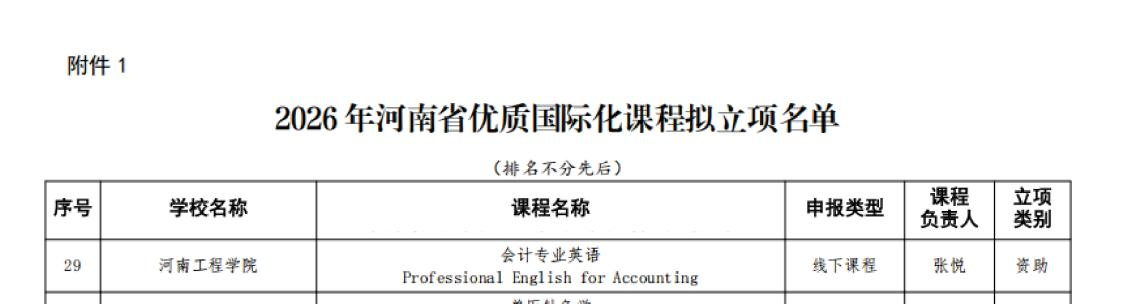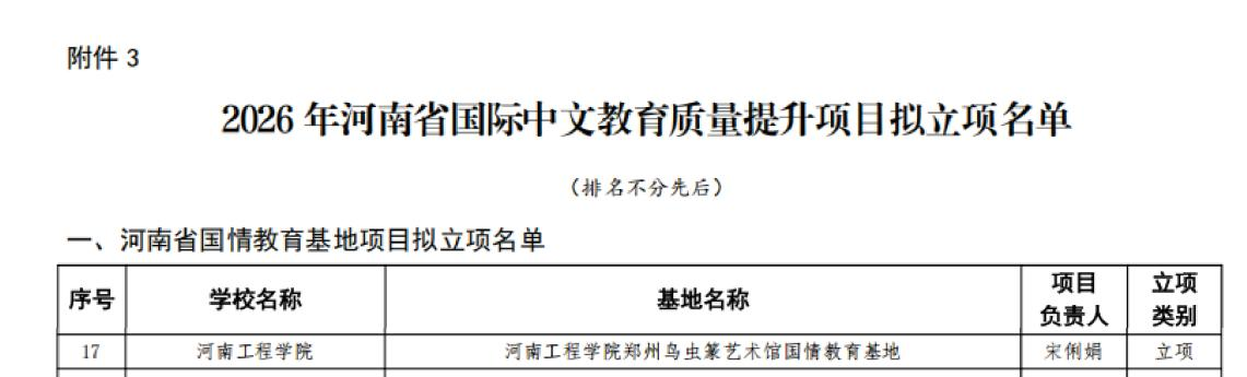 近日,河南省教育厅公布2026年优质国际化课程等项目立项名单,我校申报的《会计专业英语》获批河南省优质国际化课程项目,《河南工程学院郑州鸟虫篆艺术馆国情教育基地》获批河南省国际中文教育质量提升项目。