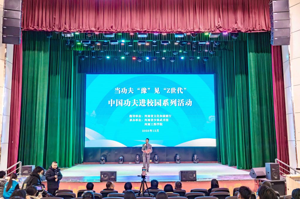 12月3日下午,我校西区创新创业大礼堂内掌声阵阵,喝彩声此起彼伏。由河南省文化和旅游厅指导、河南省少林武术馆主办的“中国功夫进校园”之河南工程学院站活动正热烈开展。本次活动以“功夫‘豫’见Z世代”为主题,通过功夫展演、互动教学形式,将少林功夫带入校园,推动传统文化落地生根。校党委副书记赵红亮,校团委负责人,河南省少林武术馆馆长陈俊杰出席活动,会计学院、体育教学部师生代表参加活动。