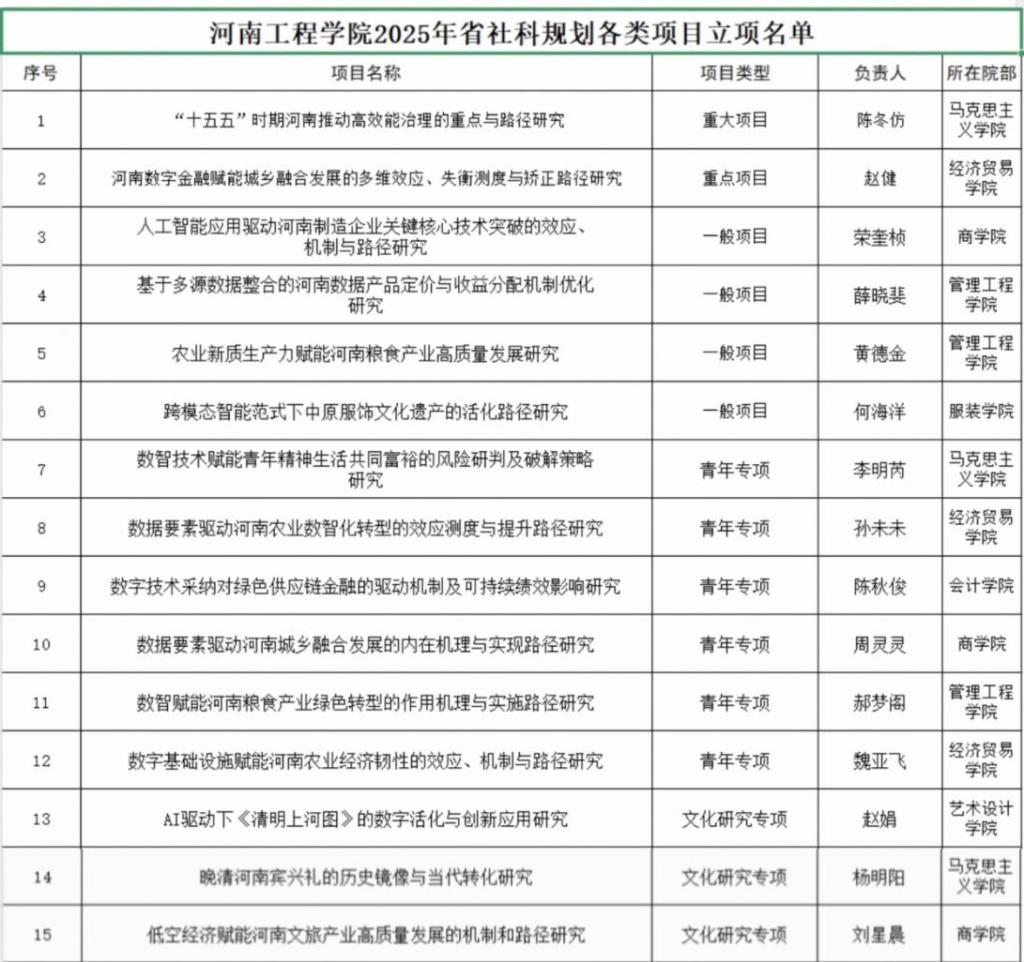 近日,河南省哲学社会科学工作事务中心正式公布 2025 年河南省哲学社会科学规划项目立项名单,我校共获批15项,其中包括重大项目1项(全省第5名)、重点项目1项(全省第22名)、一般项目4项、青年项目6项以及文化工程项目3项。