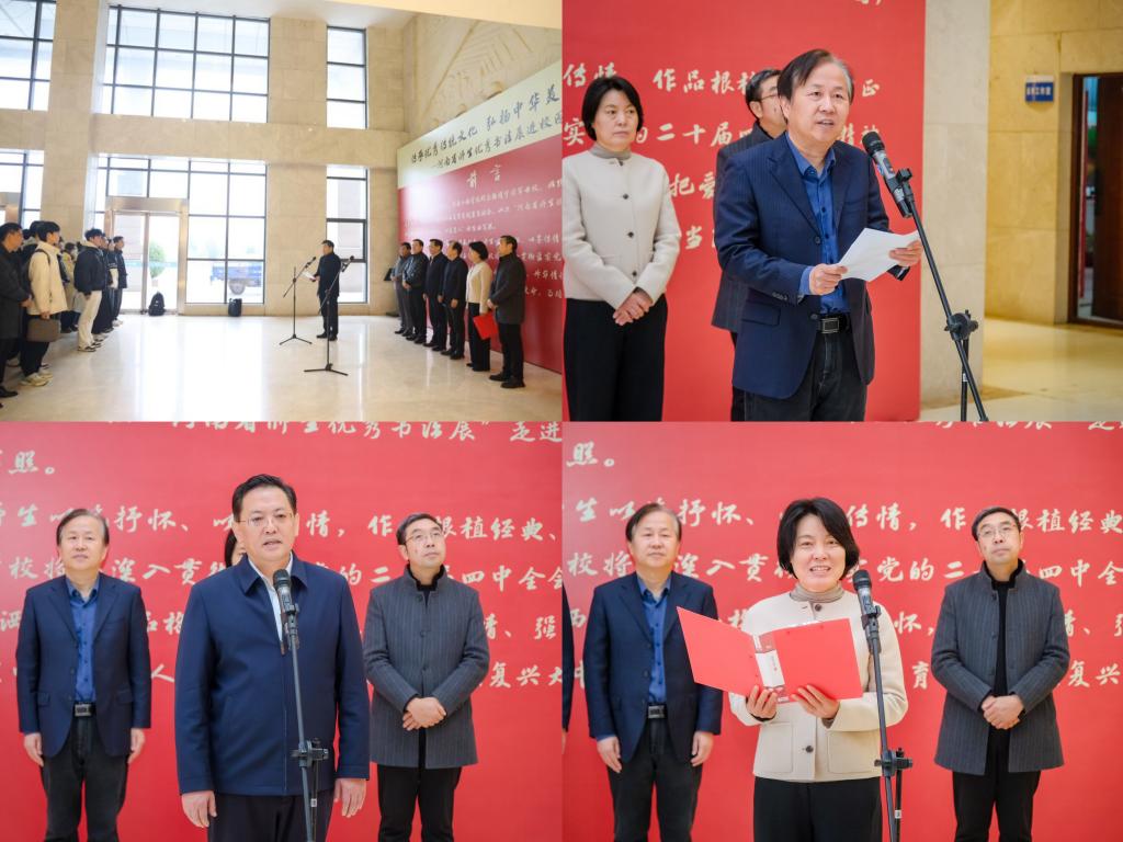 闫治国在讲话中充分肯定了本次活动的时代意义。他表示,河南作为华夏文明发源地,深厚的文化底蕴是中华民族的精神寄托,更是美育工作的独特优势。当前全省高校已形成层次分明、覆盖全面的美育课程体系,美育人才培养成效显著。他指出,推动美育教育从“有”向“优”迈进,需锚定三大方向:一要积极落实上级部门对美育工作的有关部署,构建美育工作新格局。以强有力的组织领导为保障,不断提高育人质量。二要以三全育人系统化落实机制为抓手,开创美育工作新局面。依托“三全育人”机制优化资源配置、建强师资队伍、补齐发展短板,激活美育生态活力。三要以特色美育活动为抓手,打造美育教育教学新模式。抢抓数字化机遇推进美育信息化,强化场馆育人功能,推动传统文化与高校美育深度融合,以美育高质量赋能人才培养。他希望,学校要以本次书法展为新的起点,坚定文化自信,强化使命担当,共同书写新时代我省高校美育工作高质量发展的崭新篇章,为谱写中原更加出彩的绚丽篇章贡献教育力量。