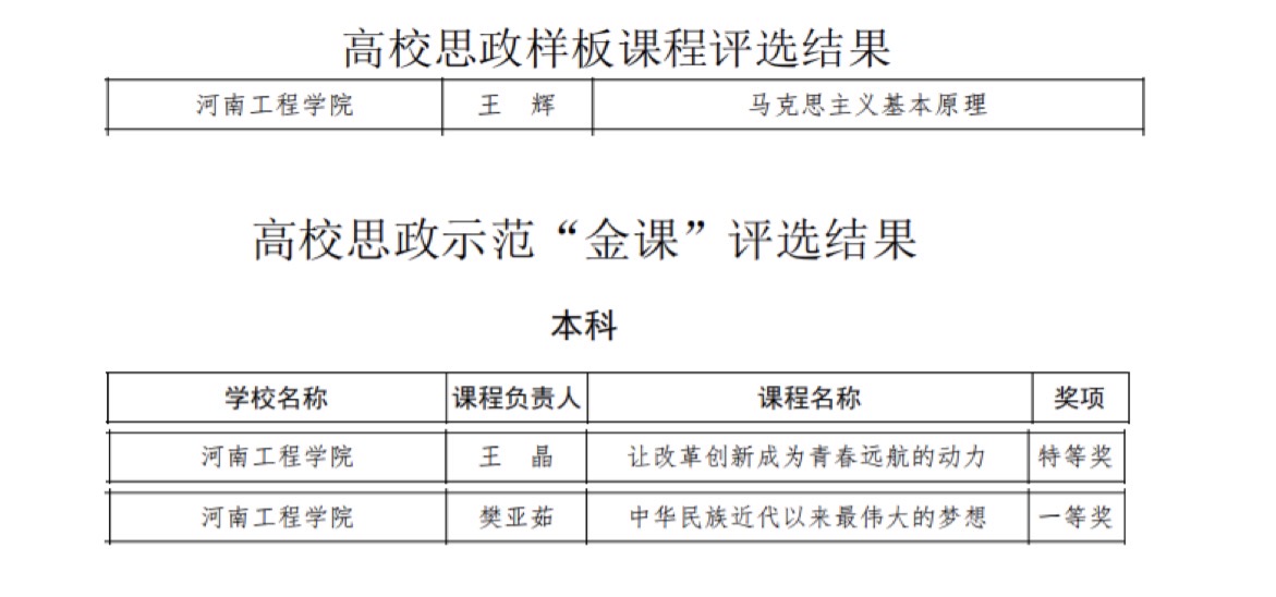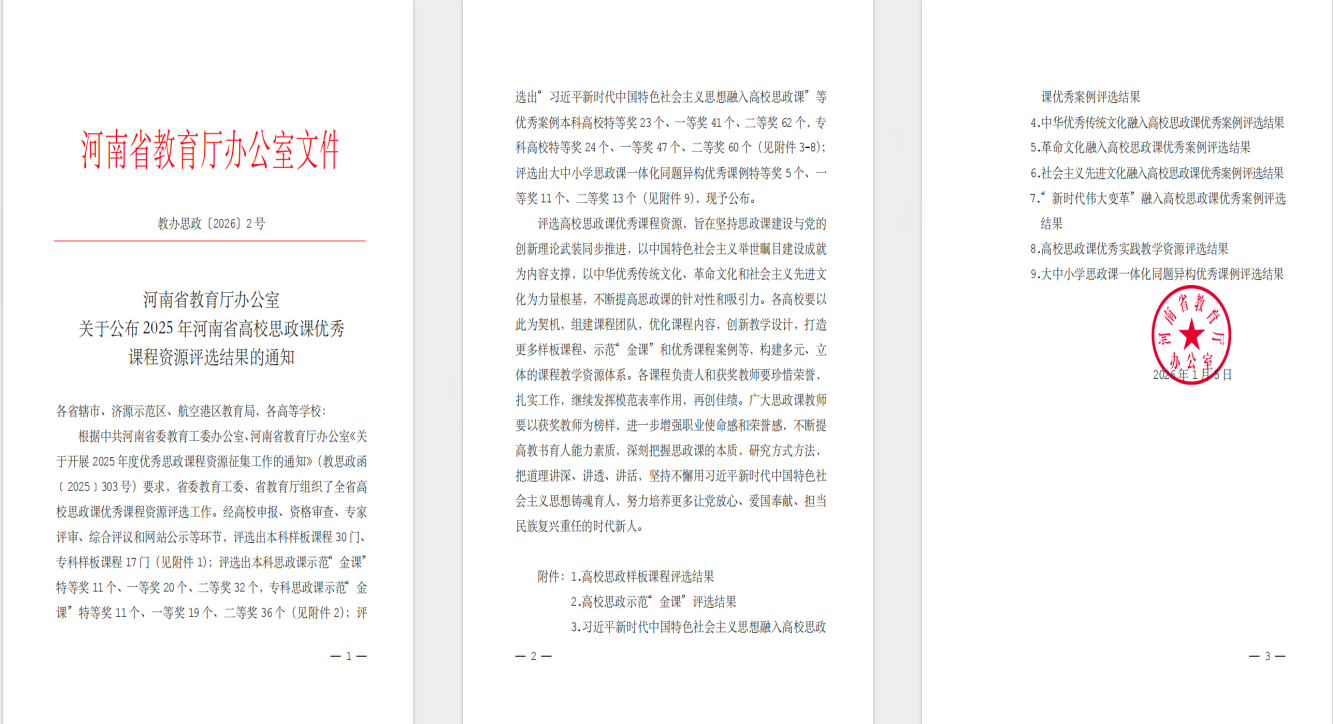 近日,中共河南省委教育工委办公室、河南省教育厅办公室公布了2025年度优秀思政课程资源评审结果。经过高校申报、资格审查、专家评审、综合评议等多环节严格遴选,我校马克思主义学院教师在多个评审类别中表现突出,王辉老师主持的《马克思主义基本原理》获批高校思政样板课程,王晶老师讲授的《让改革创新成为青春远航的动力》和樊亚茹老师讲授的《中华民族近代以来最伟大的梦想》分别获高校思政示范“金课”特等奖和一等奖。据悉,为确保优质资源脱颖而出,本次优秀思政课程资源评审标准更高、要求更严,旨在致力于深化思政课的改革创新,推动思政课实现高质量发展。此次成绩的获得,既体现了获奖教师扎实的教学功底与科学的课程设计理念,也彰显了马克思主义学院在落实立德树人根本任务、推进思政课教学改革创新方面的显著成效。