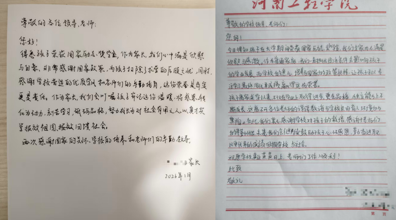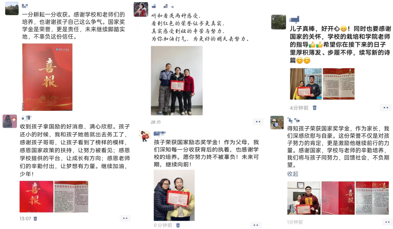 家长们通过感谢信、微信等社交媒体,表达对国家和学校资助政策的诚挚感谢与高度赞扬。这不仅是一纸成绩的见证,更是学校 “资助 + ”育人理念的生动体现 —— 让资助有温度,让育人有力量。家校携手,共同助力学子在人生路上行稳致远,在时代浪潮中书写无愧于青春的奋斗篇章。