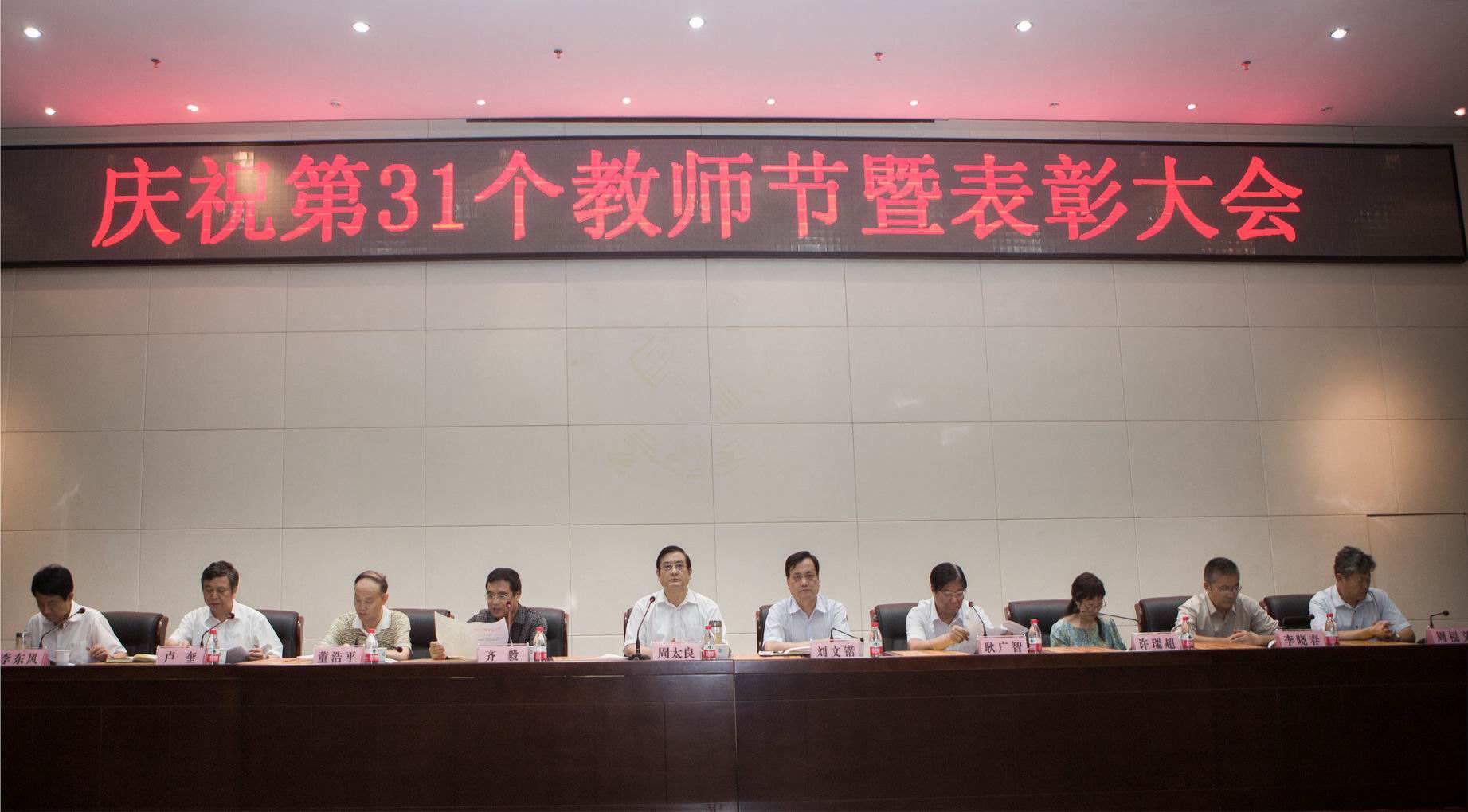 9月9日下午,我校在综合楼二楼会议室隆重举行庆祝第31个教师节暨表彰大会。校领导出席会议并为受表彰的先进集体、先进个人颁奖。师生代表300余人参加了会议。会议由校党委书记周太良主持。