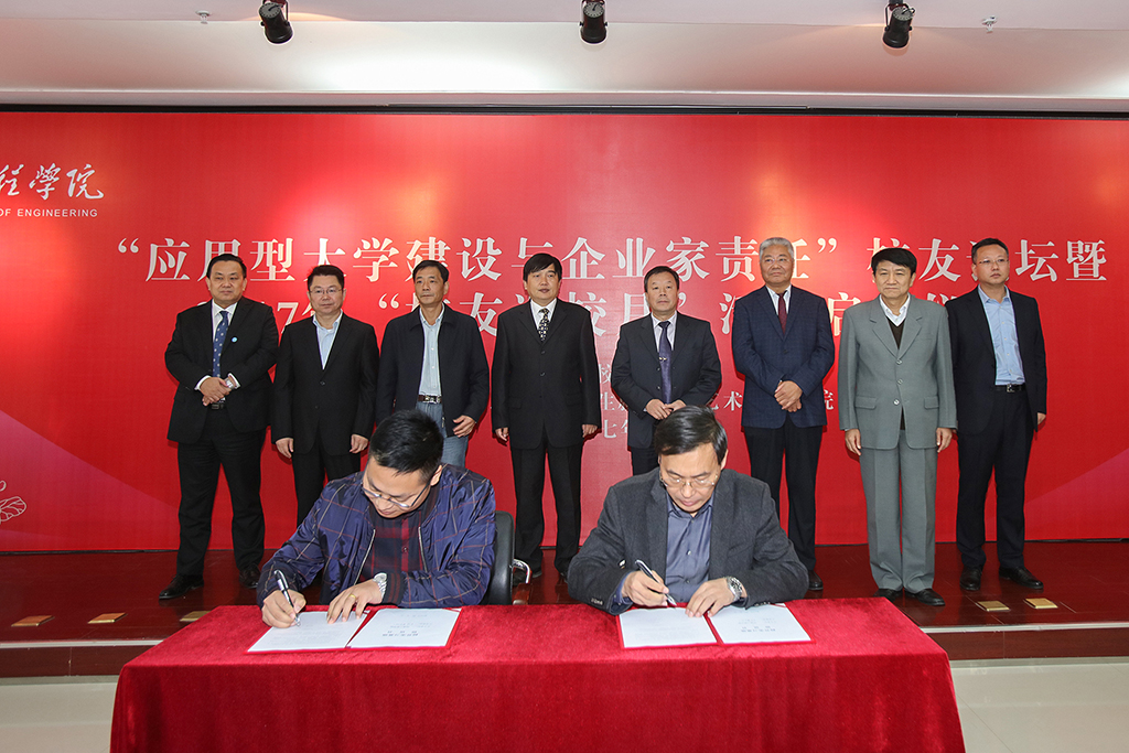 在校领导和广大校友的见证下,工商管理学院与河南万邦国际农产品物流股份有限公司、艺术设计学院与平顶山鑫垚农耕文化实业有限公司、经济贸易学院与阿里巴巴、郑州风潮信息技术有限公司分别签署校企合作协议。校友企业郑州旗帜设计有限公司在我校捐设100万元的“旗帜大学生创业基金”,助推学校“双创”工作开展。浙江校友会向母校赠价值50万元的纺织服装面料,服务我院纺织服装专业师生实习实训,助推师生创新创业。广东校友会向母校捐赠广东石湾陶瓷工艺品《硕果累累》,平顶山校友会向母校捐赠3件钧瓷和1件葫芦工艺品,陕西校友代表马沈歧撰写并朗诵了《河南工程学院本科新校十年庆》,分别以不同的形式表达对母校培养之恩的感谢。测量工程专业86级20多位集中返校校友在仪式现场代表全班36位校友捐赠3600元现金感恩母校,并号召广大校友以年度捐赠的形式回馈母校。