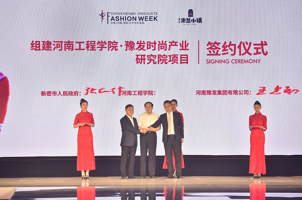 5月27日,2019中国(河南)国际大学生时装周闭幕式在河南新密豫发•米兰小镇隆重举行。闭幕式上,我校副校长王永恒,新密市市委副书记、市长张红伟,河南豫发集团有限公司副总经理王建勋分别代表河南工程学院、新密市人民政府、河南豫发集团有限公司签署“河南工程学院•豫发时尚产业研究院”合作协议。