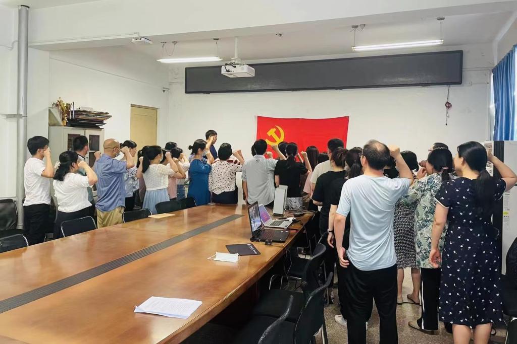 活动议程第二项为“重温入党誓词活动”,各位党员教师聚集在党旗前,高举右手,庄严宣誓。铿锵有力的宣誓声响彻会议室,激昂洪亮的12句入党誓词传达出身为中共党员的神圣感和自豪感,让现场党员深刻感受到肩上的责任和使命。