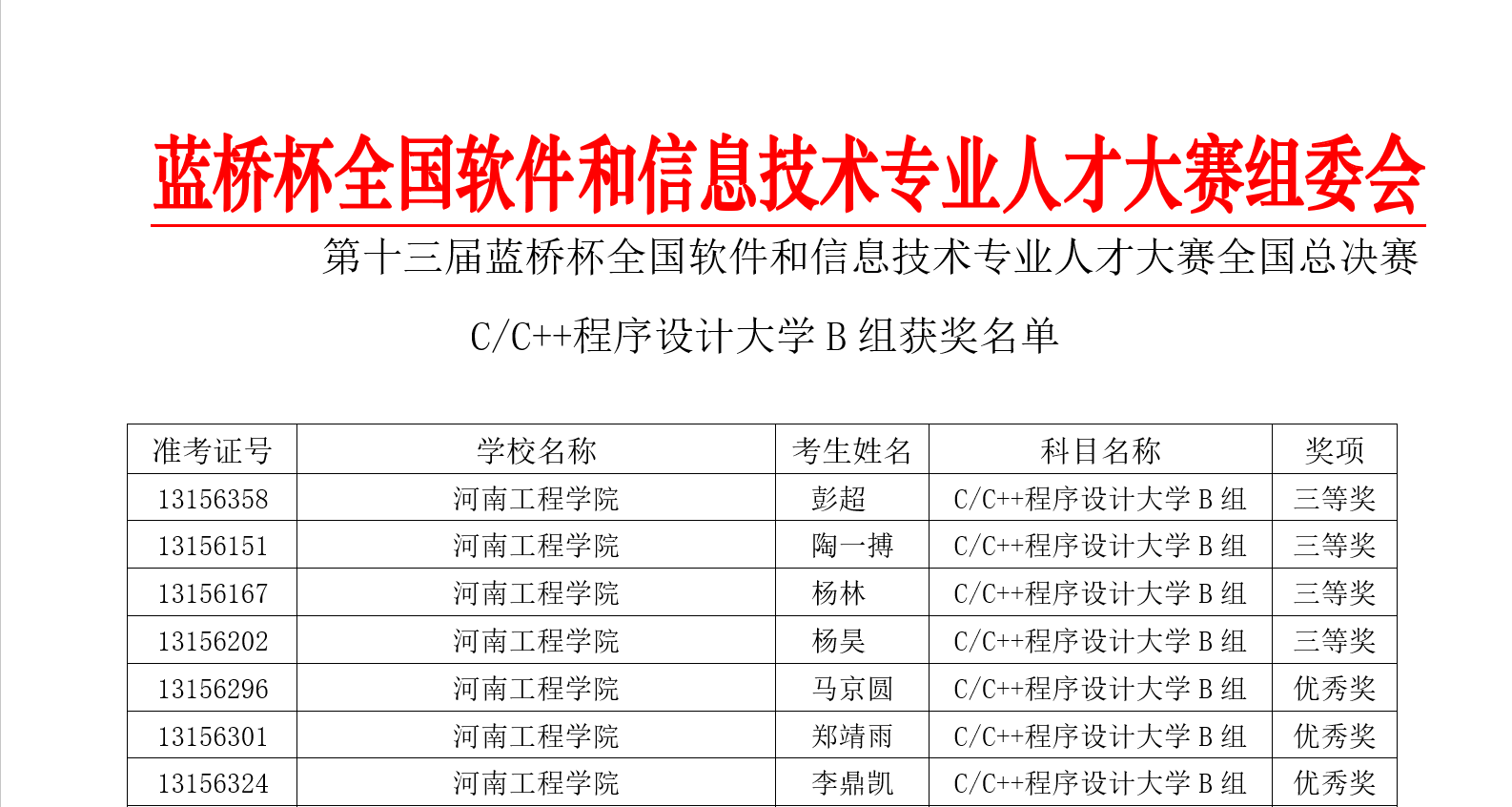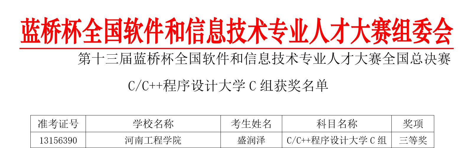 6月18日,“第十三届蓝桥杯全国软件和信息技术专业人才大赛”全国总决赛圆满落幕。软件学院共8人参赛,获国赛三等奖4项,优秀奖4项。本次比赛,软件类C/C++程序设计大学C组我省共进入决赛10人,我院21级计算机应用技术专业学子盛润泽荣获本组全国总决赛三等奖,是我院首届三年制专科大一新生首次参加国家级竞赛。