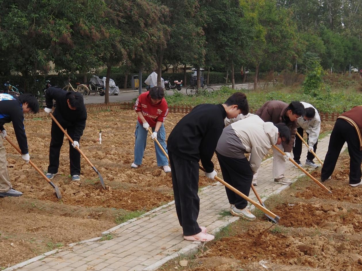 活动伊始,知行社区党委书记李长建向师生们分享了播种经验,并现场进行了耕地劳动技巧的示范,随后,社区驻楼辅导员张石磊、范程阳、曹文锦与学生党员们一道,戴上手套、手持铁锹、锄头、铁耙等农用工具,分工协作、配合默契,对劳动基地田地进行了翻土、播种和覆土等农耕实操,师生们有条不紊地投入到了劳动之中,感受劳作活动带来的乐趣。