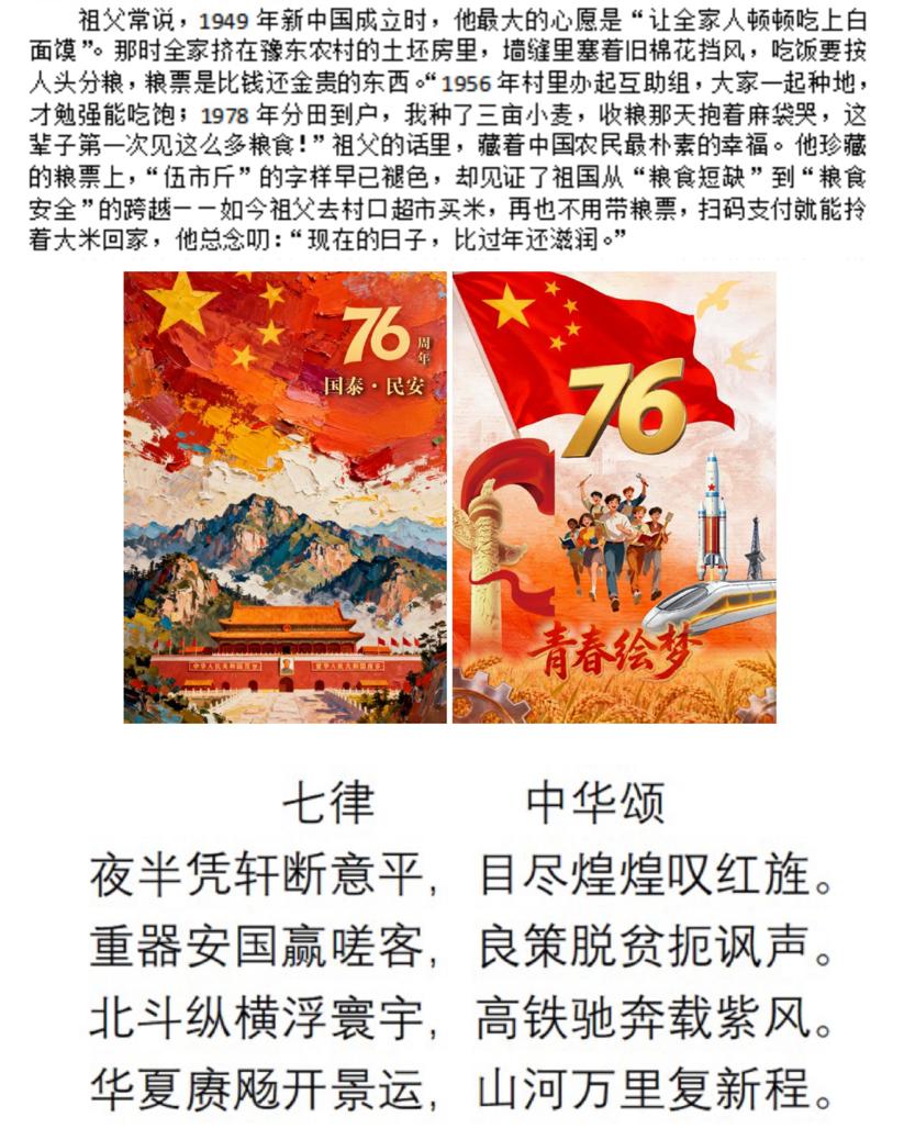 征文类作品以笔墨书写时代,用心灵感悟变迁。作品《从家的窗口望祖国:三代人眼中的76年变迁》通过家庭叙事折射宏大国史,展现个人命运与民族复兴的同频共振;作品《桥之变:从隔阂到连接的七十六载家国路》以“桥”为意象,喻示国家从封闭到开放、从追赶到引领的奋进历程。这些作品不仅彰显了文学魅力,更体现了新时代青年对国情、社情、民情的热切关注。