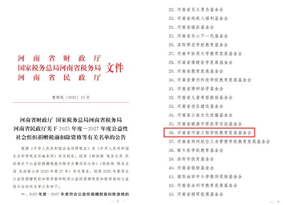 近日,省财政厅、省税务局、省民政厅联合发布《关于2025年度-2027年度公益性社会组织捐赠税前扣除资格等有关名单的公告》(豫财税〔2025〕15号)。我校教育发展基金会荣列榜单,正式获得2025年度至2027年度公益性捐赠税前扣除资格。这标志着基金会的规范运作和公益属性获得了权威部门的认可,为学校广泛吸纳社会资源、助力事业发展开启了更广阔的通道。