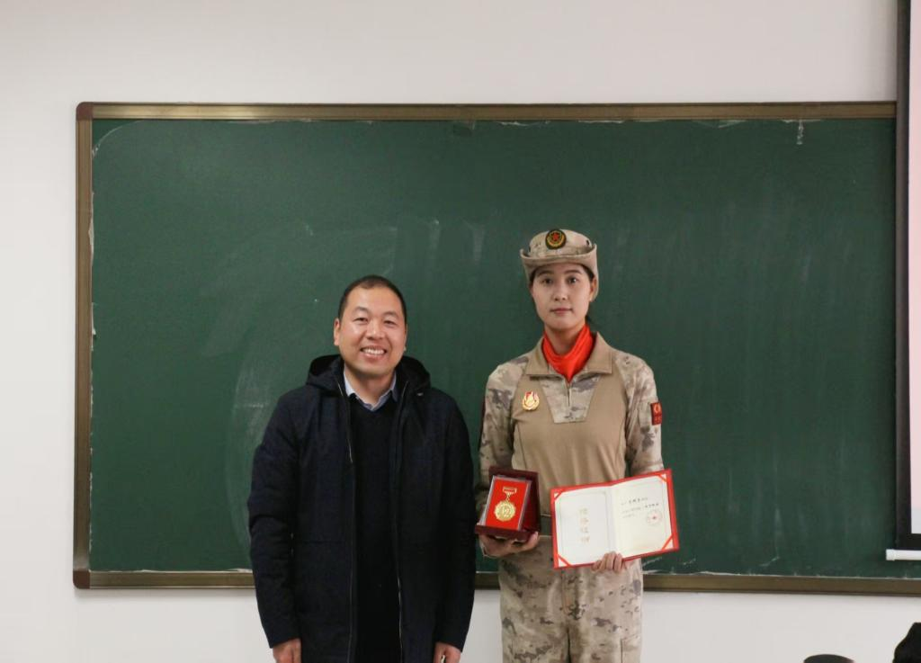 报告会上,主持人宣读了纪念中国人民抗日战争暨世界反法西斯战争胜利80周年徒步方队指挥部表扬信。学院党委书记刘付军为校友李娜杰颁发了河南工程学院“靖宇标兵”荣誉证书及勋章。