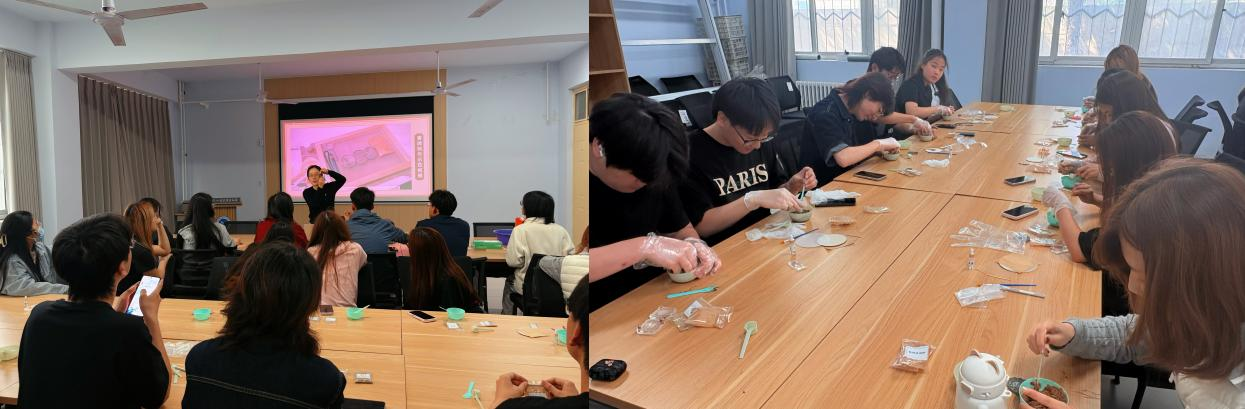 活动伊始,邓歌为同学们展示了多款形制精美、香气雅致的古法香牌成品,古朴的造型、温润的质感与清幽的香气瞬间点燃了大家的参与热情。随后,邓老师结合香材教具,细致讲解香牌历史文化底蕴,拆解制香流程为和香、揉泥、制模、修边、阴干等步骤,针对香泥塑形、脱模定型等实操难点逐一示范,并叮嘱工具使用与香材保存的注意事项。实践环节中,同学们以吉祥纹样、古风图案为创作灵感,通过挑选香材、调配香方、按压塑形、装饰点缀等方式潜心创作,充分展现出细腻的审美感知与扎实的动手能力。大家围坐交流、切磋技艺,历经近三小时,一块块匠心独运、香气怡人的香牌作品顺利完成。